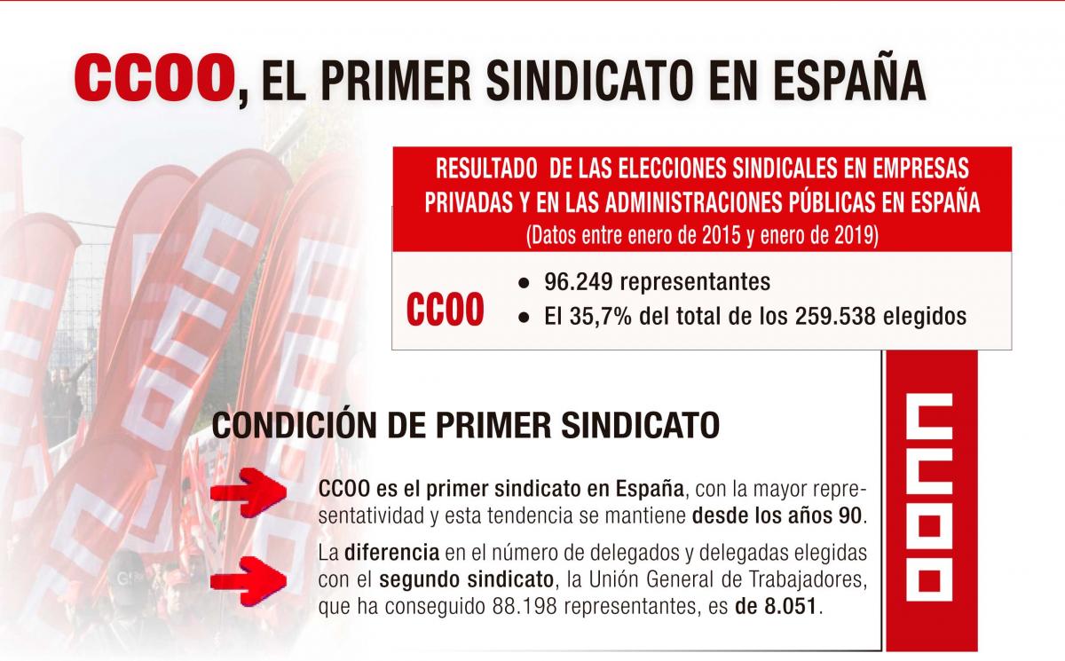 CCOO ha conseguido 96.249 delegados/as, el 35,7% del total, en las elecciones sindicales celebradas en empresas privadas y en las Administraciones Públicas. Con estos resultados, CCOO revalida su condición de primer sindicato de nuestro país, lo es desde los años 90, con una diferencia de 8.051 representantes sobre el segundo sindicato, la Unión General de Trabajadores. Así lo acredita el Ministerio de Trabajo en una certificación el día 19 de junio de 2019.